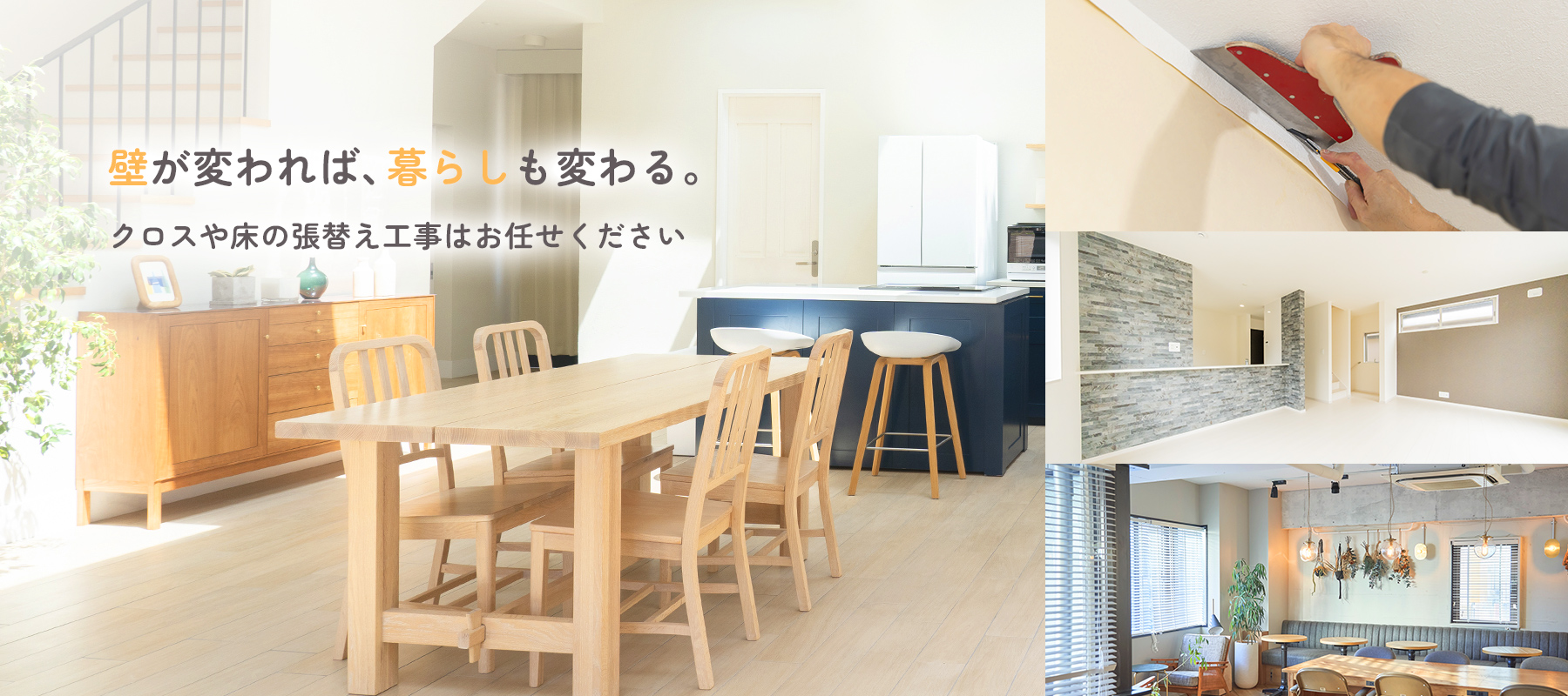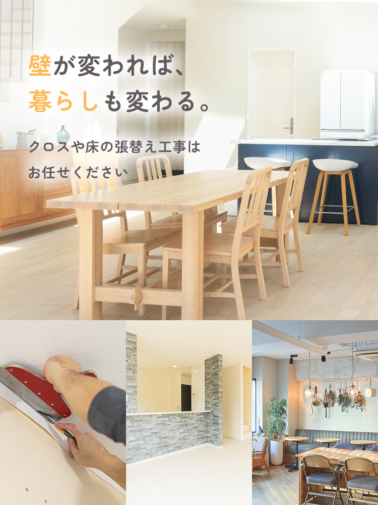 住まいの印象を大きく左右する「壁」と「床」。私たちはクロス工事・床工事を専門に、快適で美しい空間づくりをお手伝いしています。デザイン性と機能性を兼ね備えた施工で、お客様一人ひとりの理想に寄り添います。
